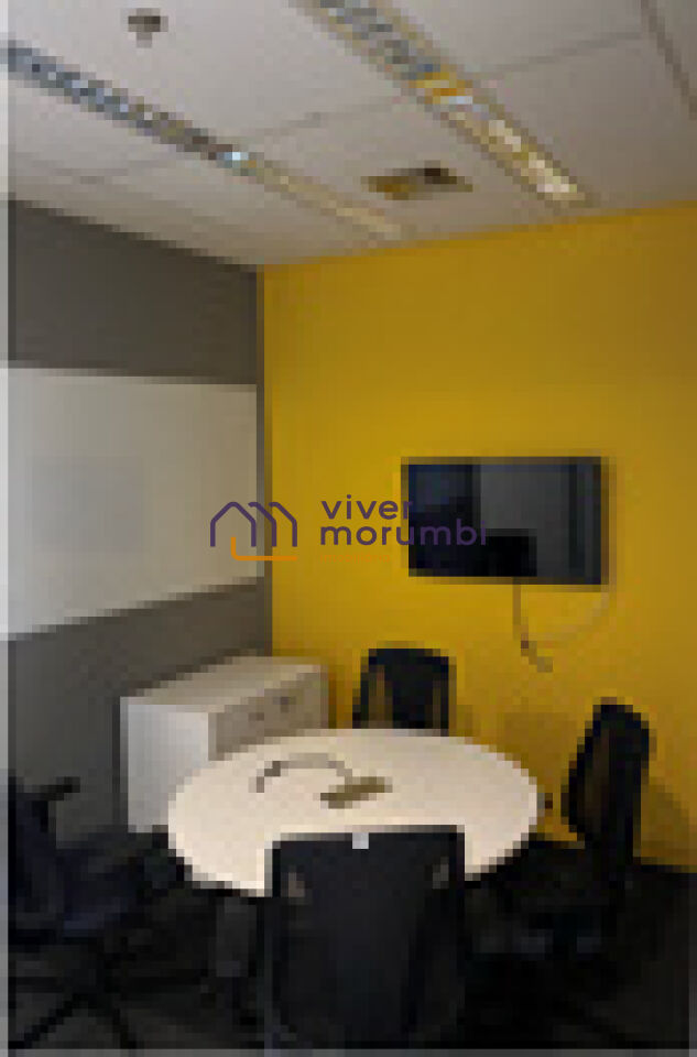 Com infra de piso elevado, forro, divisórias, salas prontas para uso, luminárias e AC.