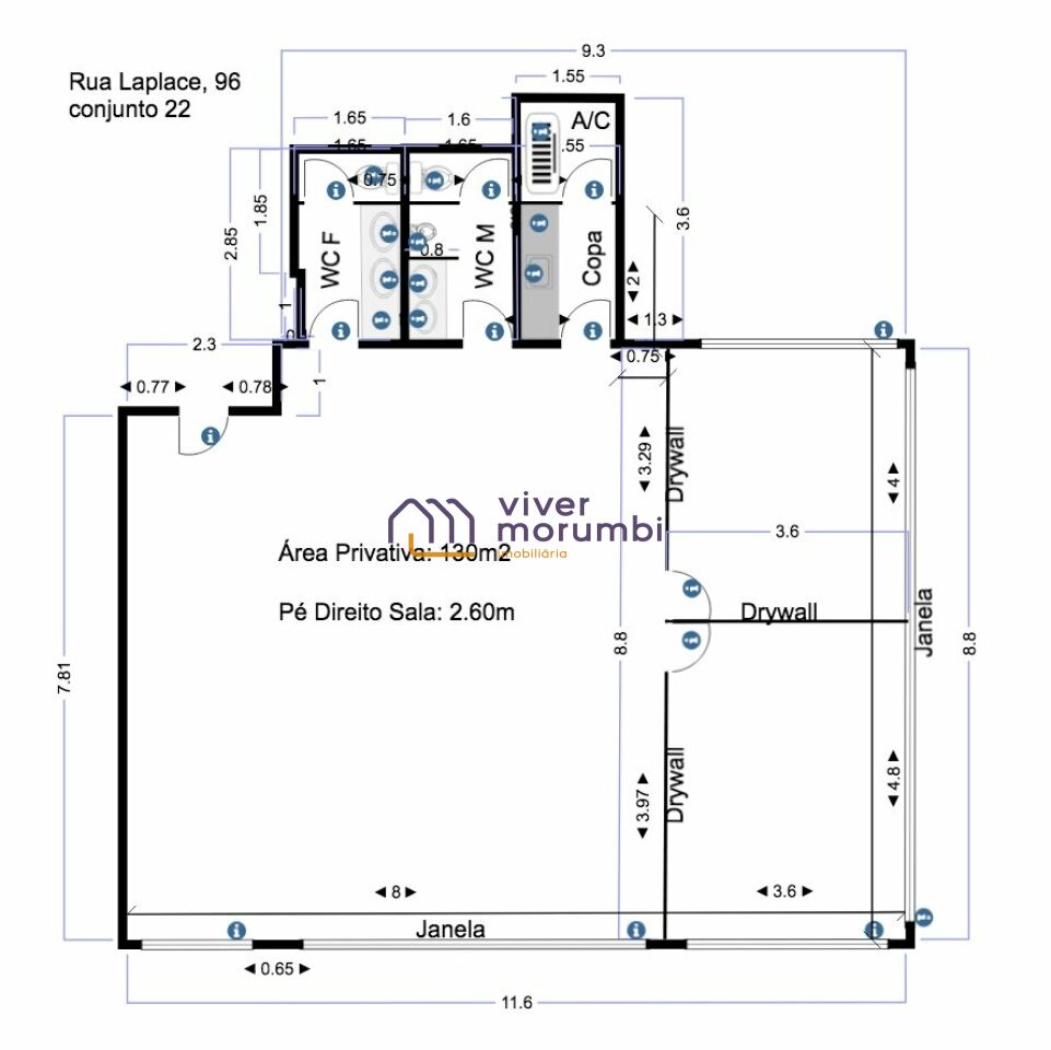 Sala comercial no Brooklin. Com 130M², dividida com drywall - Área útil: 130 m2 - Banheiros: 2 - Copa: 1 - Piso: Carpete - Forro: Gesso - Luminárias: Sim - Divisórias: Sim, Drywall - Ar Condicionado: Sim, Central - Vagas: 2, demarcadas e independentes - Sistema Completo de Telefonia e Fibra Ótica O conjunto está dividido com drywall em 01 sala grande de trabalho e 02 salas menores. Possível retirar todas as paredes, ficando tudo em vão livre. O prédio oferece: - GERADOR para Área Privativa e Comum - 02 elevadores Atlas Schindler novos - Estacionamento para Visitantes gratuito - Portaria 24h, 7 dias por semana - Segurança CFTV Localização privilegiada: - Fácil acesso pelas Avs. Prof. Vicente Rao, Vereador José Diniz, Sto. Amaro, Jornalista Roberto Marinho e Morumbi - Próximo ao Aeroporto de Congonhas - Próximo a Correio, Cartório, Bancos, Restaurantes, Comércios em Geral - A 5min a pé da Estação de Metro Brooklin (Linha 05 - Lilás) e 10min da Estação Campo Belo (Linha 05 - Lilás 2018 e Linha 17 - Ouro 2019) - Fora da Zona de Rodízio de Veículos Garantia Locatícia: - Caução Imobiliária de imóvel comercial - Carta Fiança Bancária - Fiador Pessoa Física com imóvel em SP Capital - Seguro-Fiança (Porto Seguro) - Título de Capitalização (Porto Seguro) - Depósito Caução Imóveis no Morumbi. Apartamento, Casa e Condomínio Venda. Os melhores Apartamentos, Casas e Imóveis no Morumbi, Panamby, Real Parque, Jardim Guedala, Jardim Leonor, Vila Sonia, Brooklin, Campo Belo, Chácara Santo Antonio, Santo Amaro e região. Imobiliária Viver Morumbi. Veja nossas oportunidades.